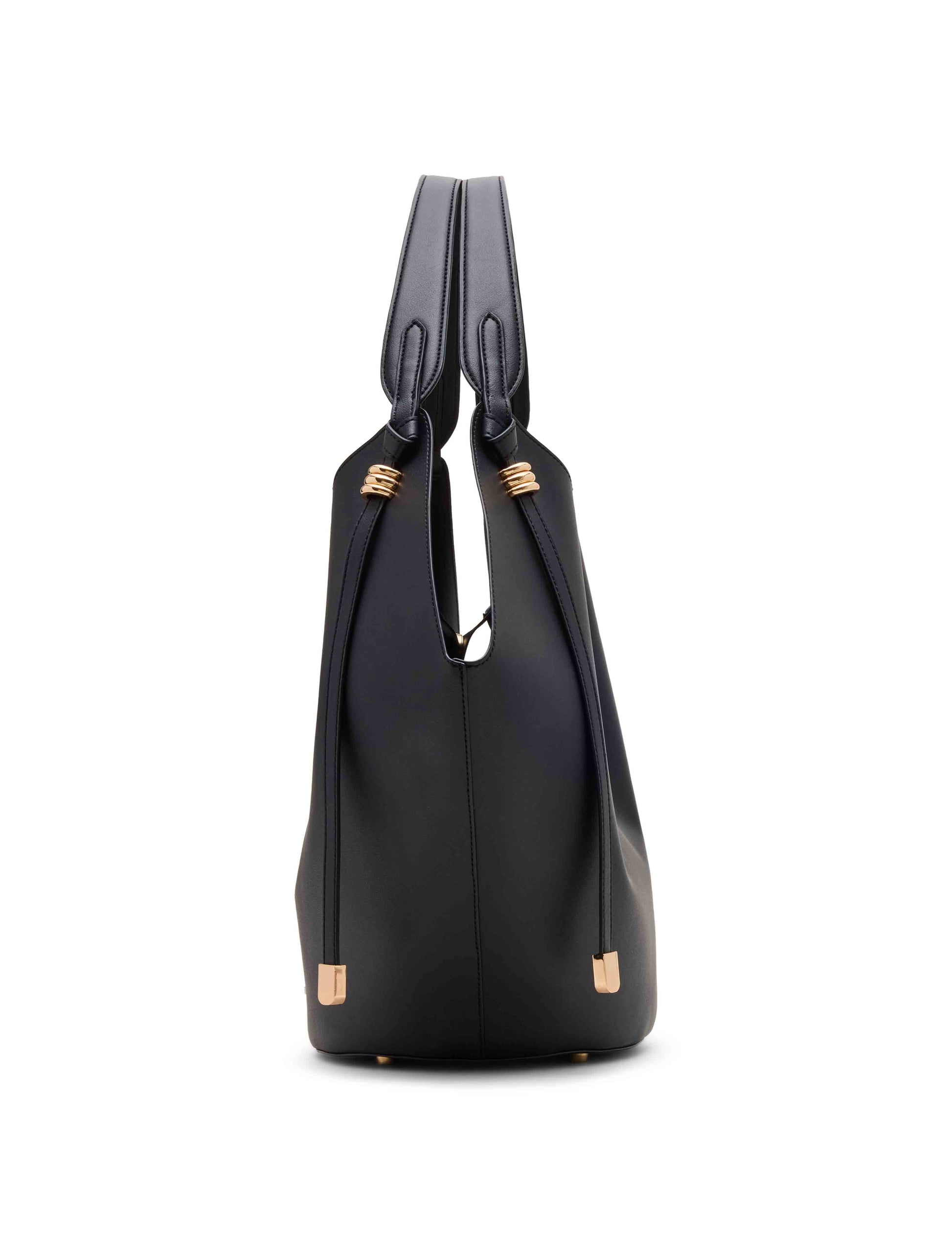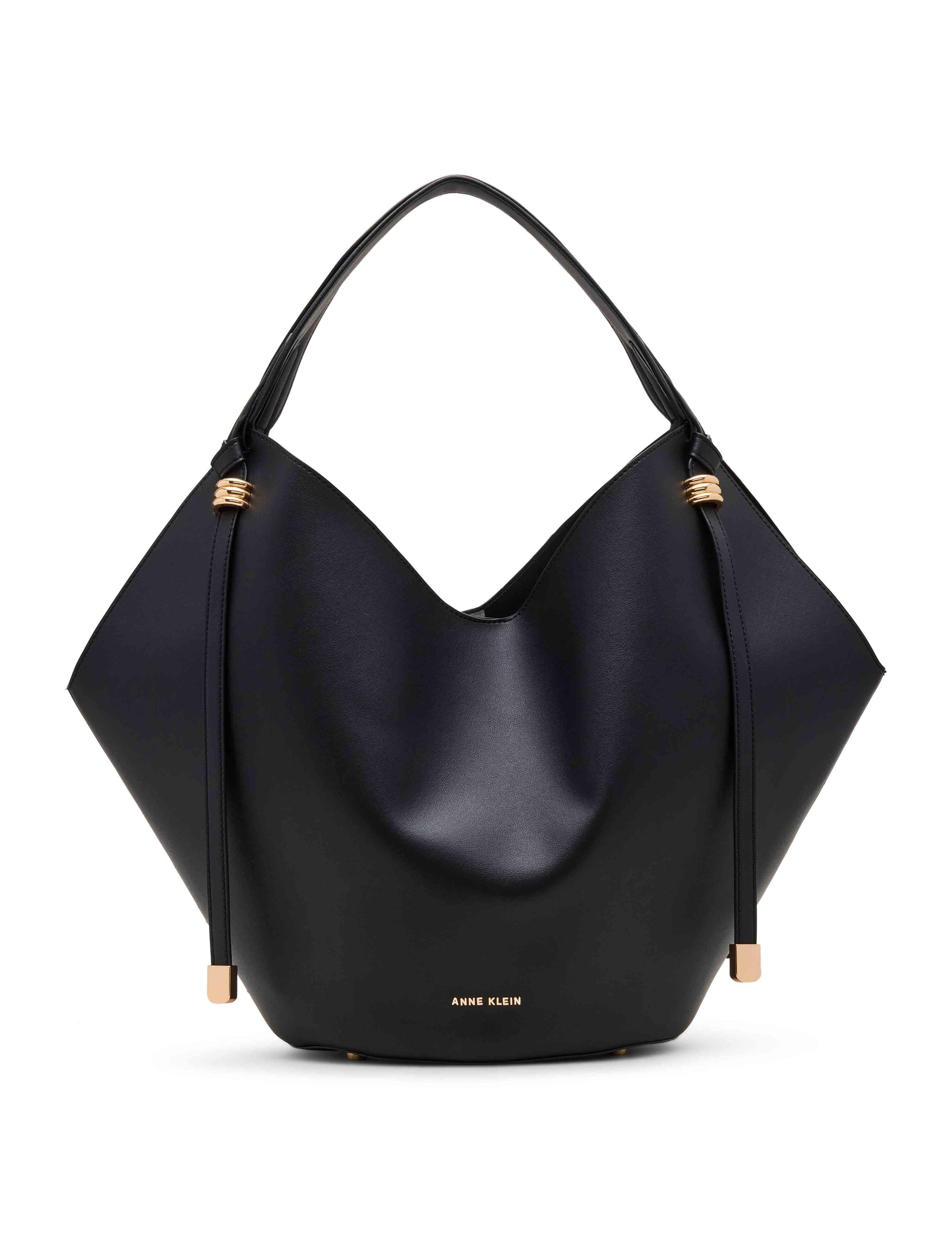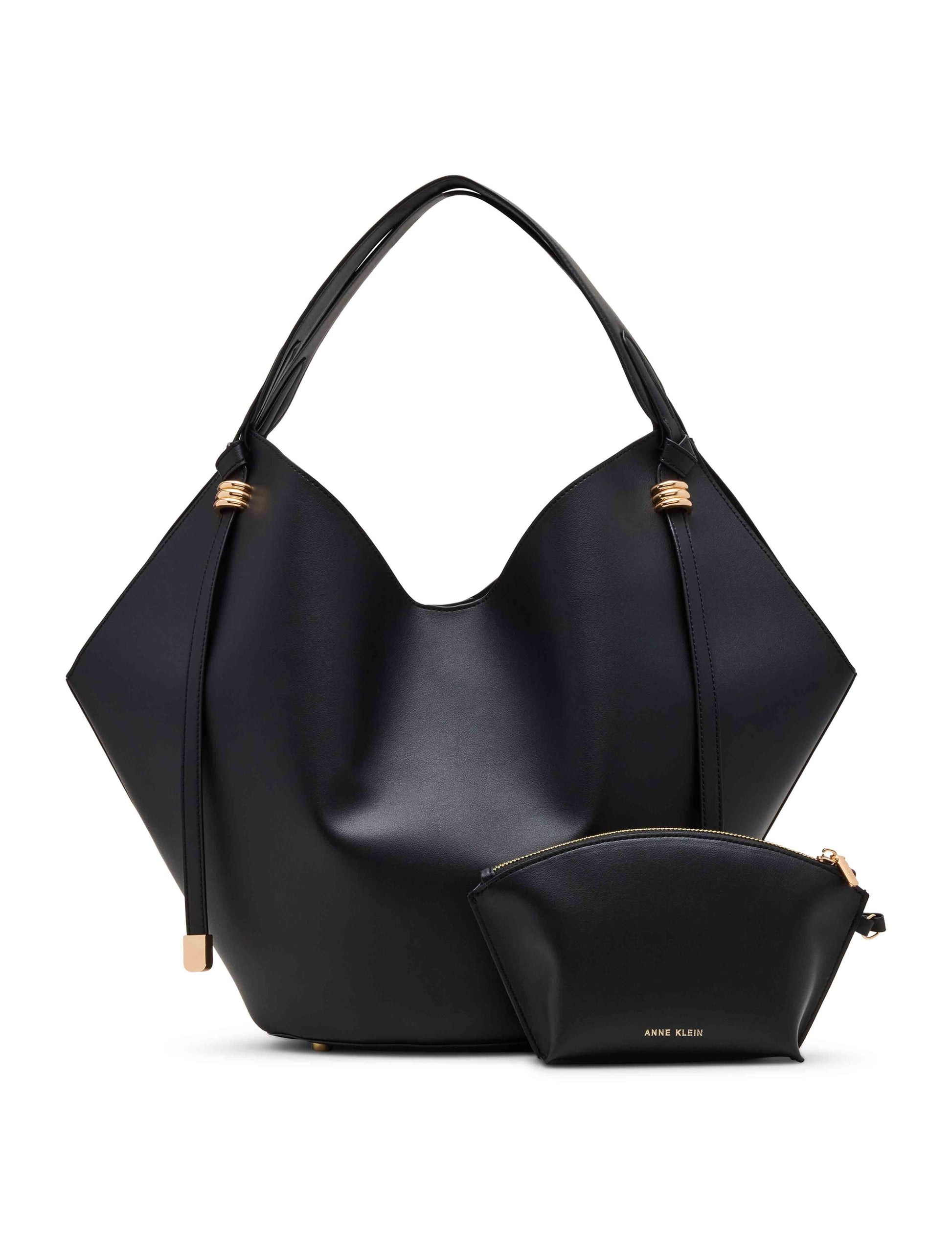 Turn heads with this structured hobo tote, crafted in a sleek material. This statement bag features a spacious interior and includes a matching zip pouch for added organization. The gold-tone hardware accents add a refined touch, while the wide shoulder straps ensure comfort.